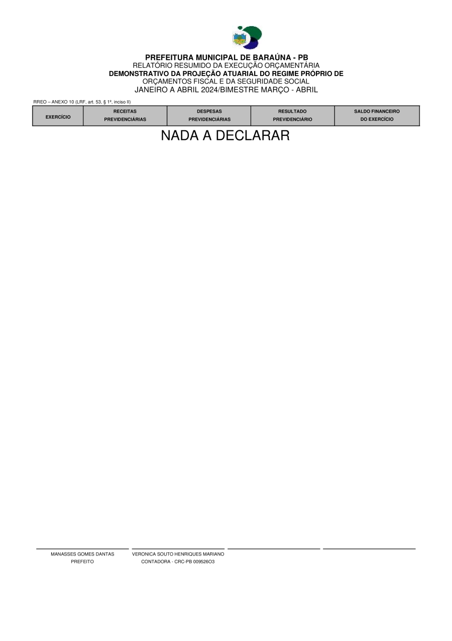• RREO ANEXO 10 – DEMONSTRATIVO DA PROJEÇÃO ATUARIAL DO REGIME DE PREVIDÊNCIA. – 01 DE JULHO DE 2024.
