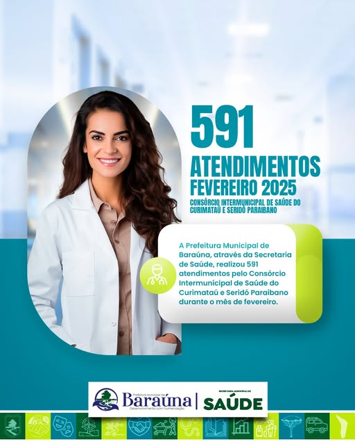 A Prefeitura Municipal de Baraúna, por meio da Secretaria de Saúde, segue se empenhando para garantir o melhor para a nossa população! No mês de fevereiro, realizamos 591 atendimentos através do Consórcio Intermunicipal de Saúde do Curimataú e Seridó Paraibano.